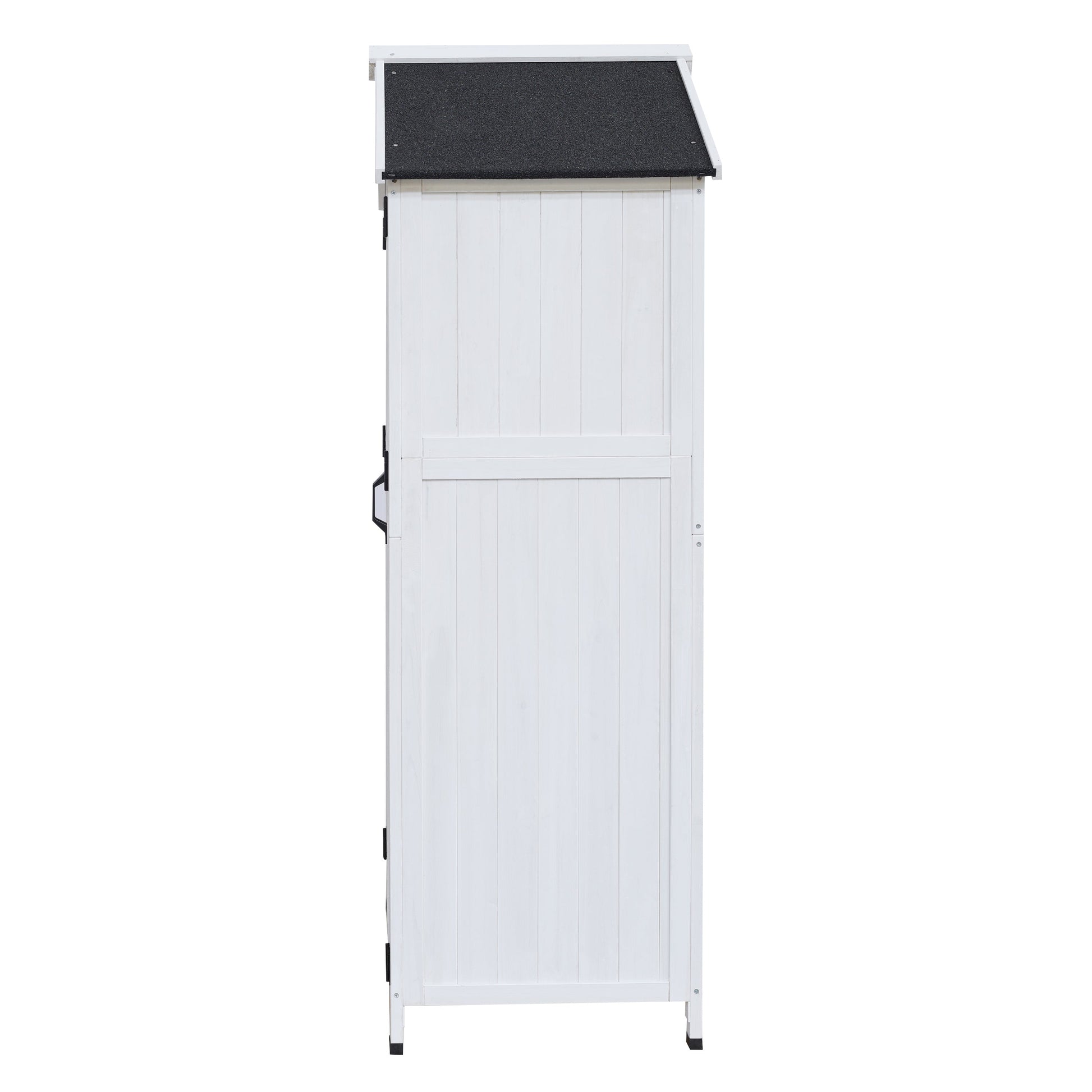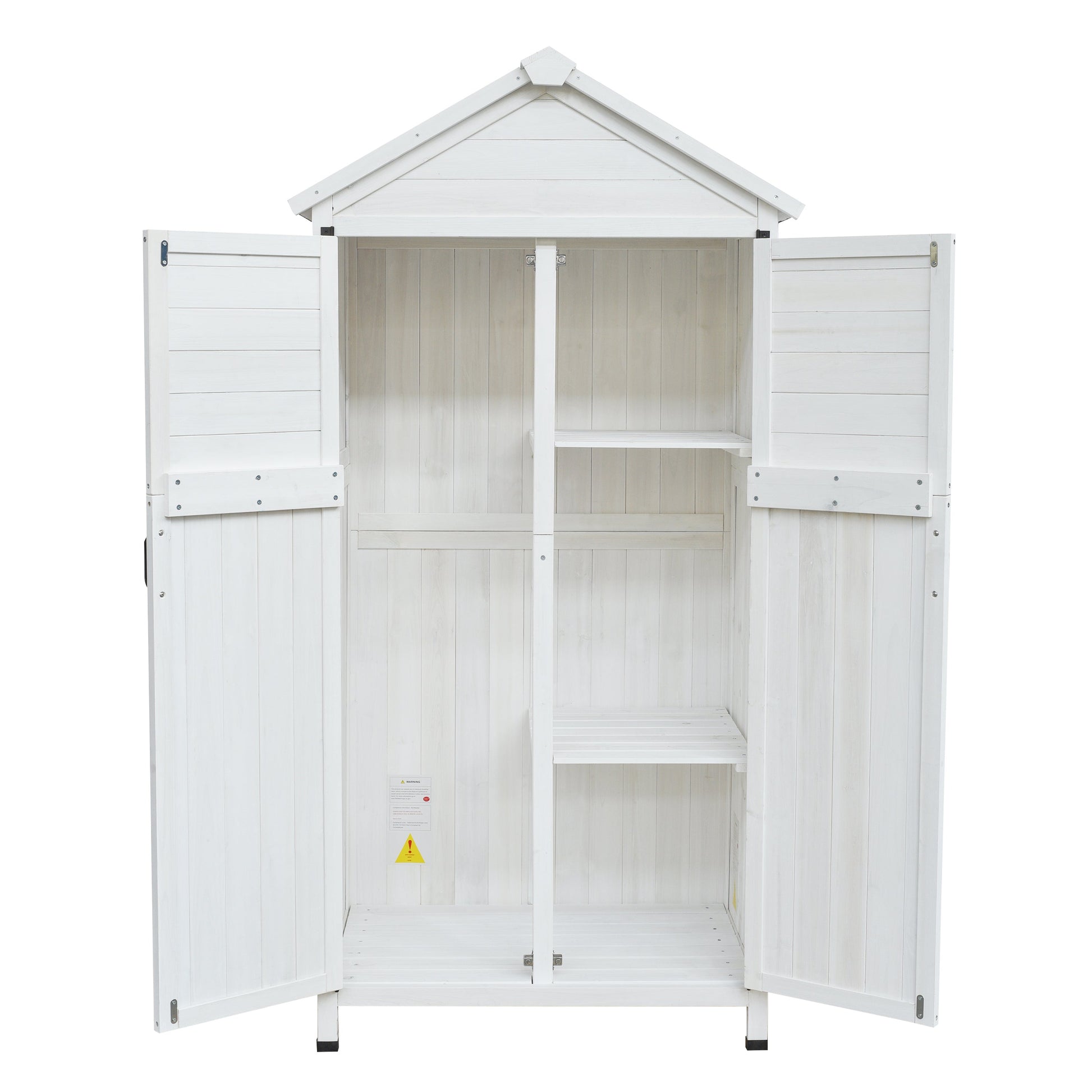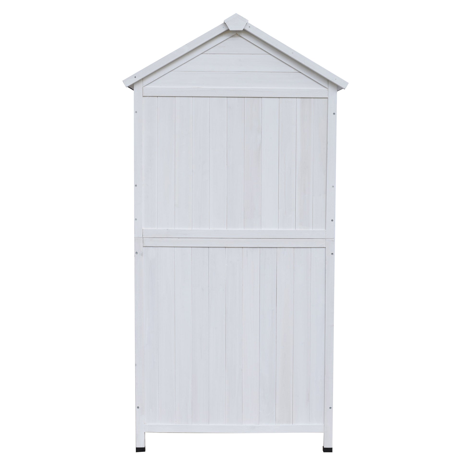 - Spacious White Storage ShedCrafted from durable fir wood, this 67-inch-tall shed features a bright white finish that blends seamlessly with outdoor spaces while providing ample storage capacity for garden tools and equipment.