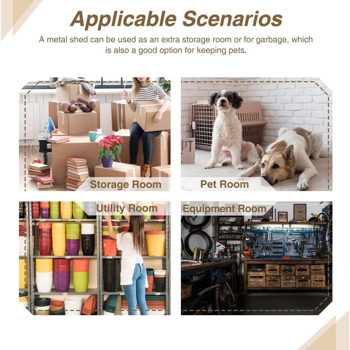 - 【All-Weather Use】Constructed with rust-resistant and UV-resistant galvanized steel, this tool shed is weatherproof. Its high-pitched roof allows rain and snow to slide off easily, the ventilation vents ensure proper airflow and prevent dampness.