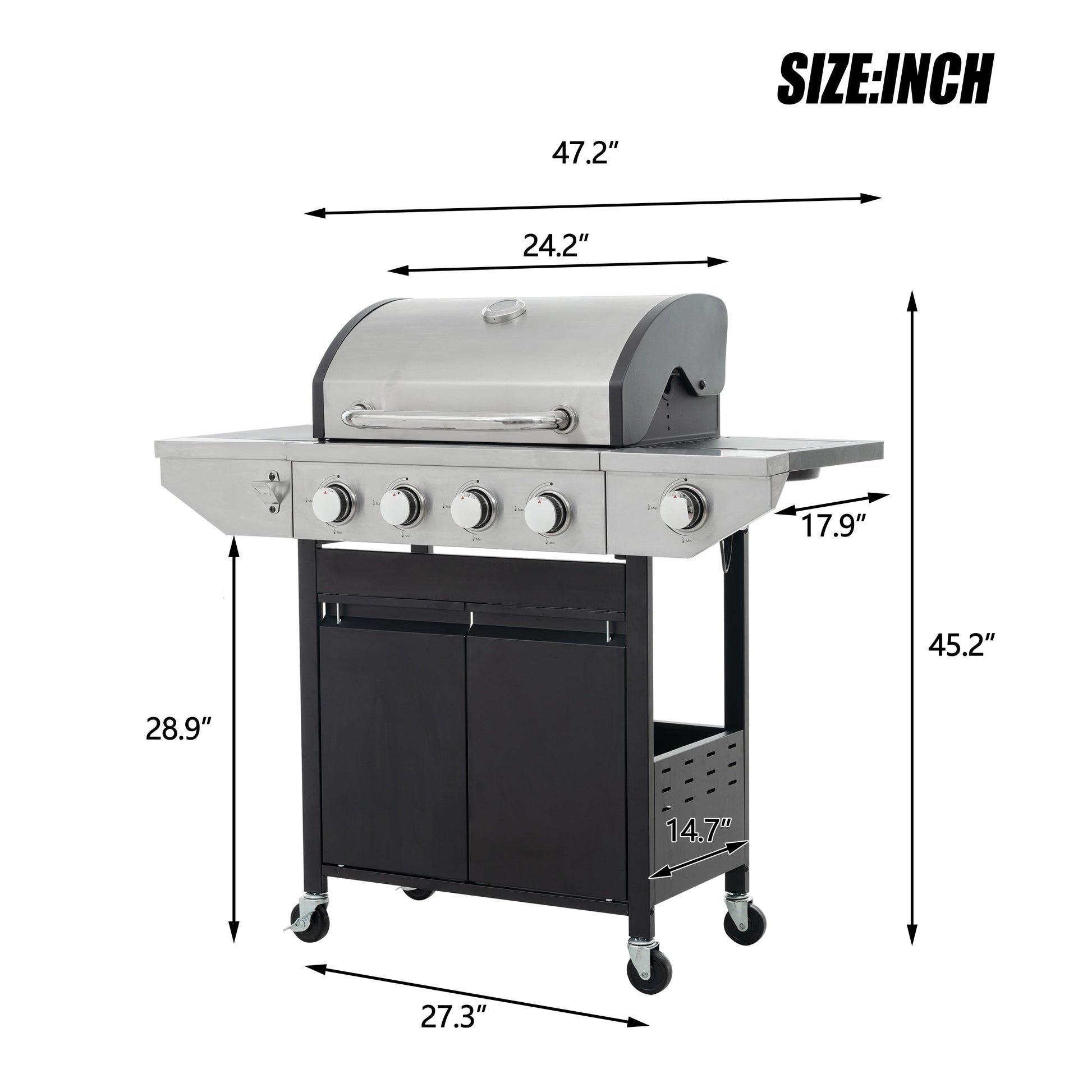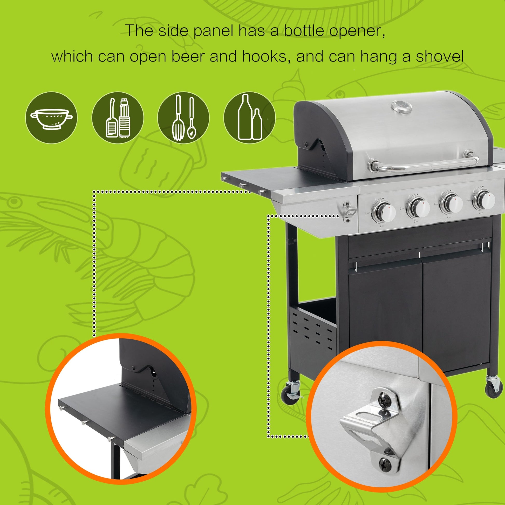 Propane Grill 4 Burner Barbecue Grill Stainless Steel Gas Grill with Side Burner, 46,500 BTU Outdoor Cooking, Patio, Garden Barbecue Grill, Black and Silver