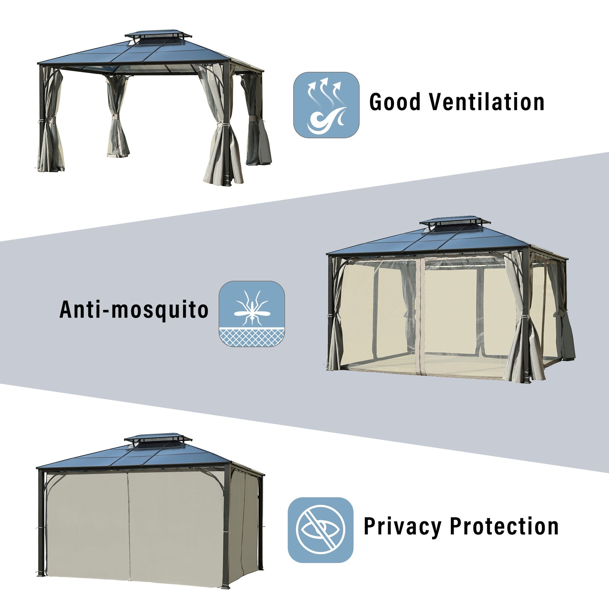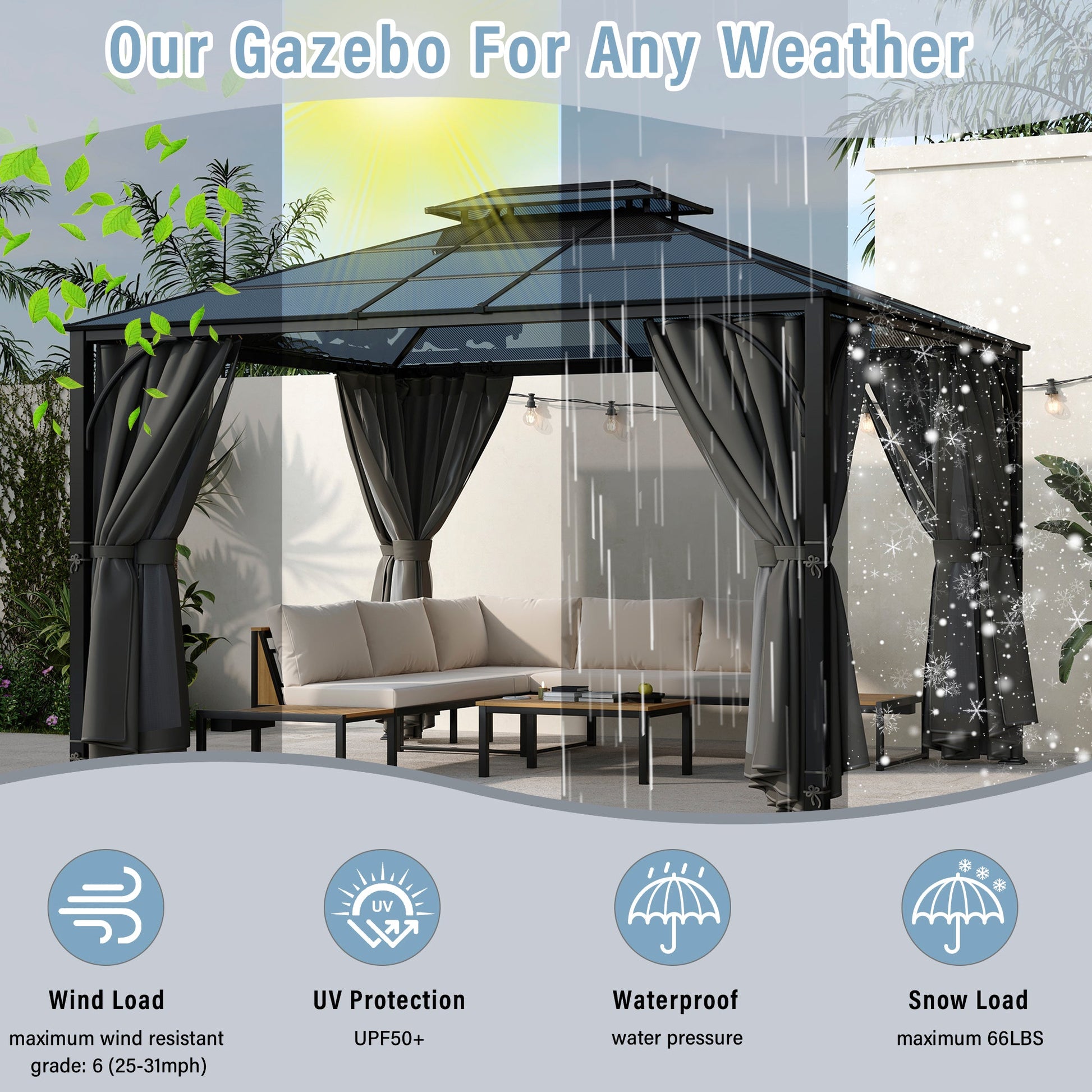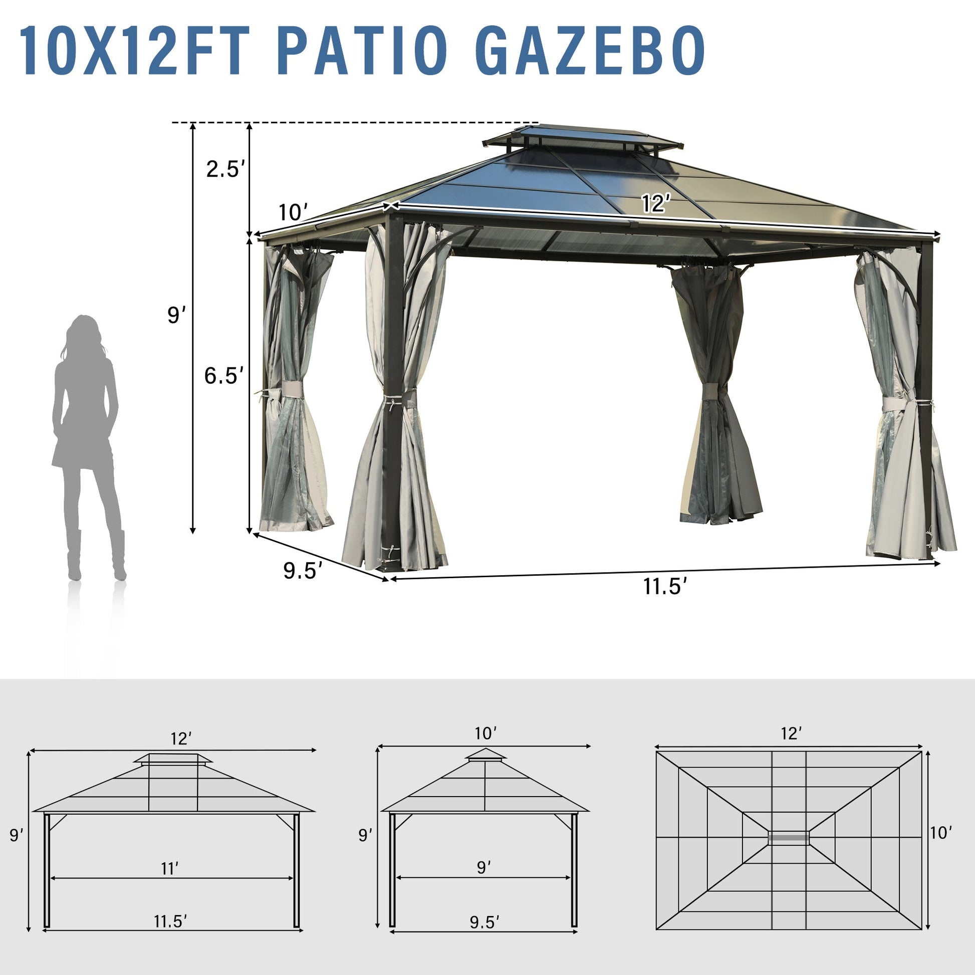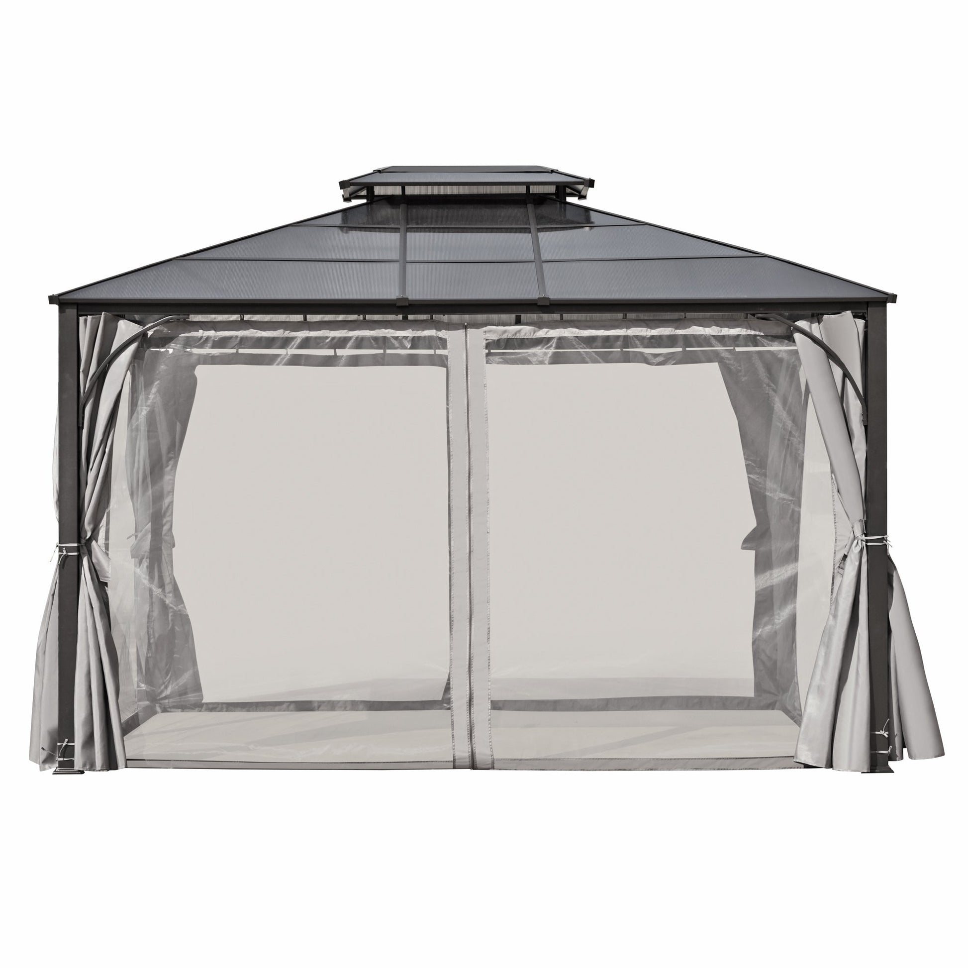 TREXM 10'x12' Hardtop Outdoor Gazebo, Heavy Duty Double Roof Patio Gazebo with Aluminum Frame, Double-Layer Side Walls Mosquito Netting & Privacy Curtains for Patio, Garden, Backyard (Grey)