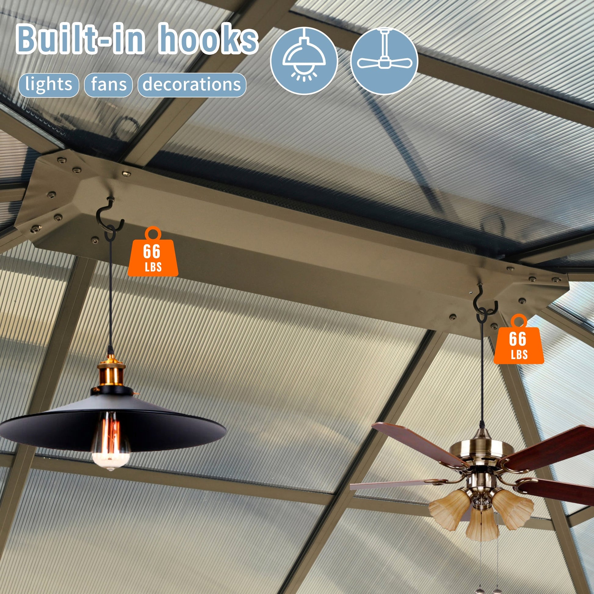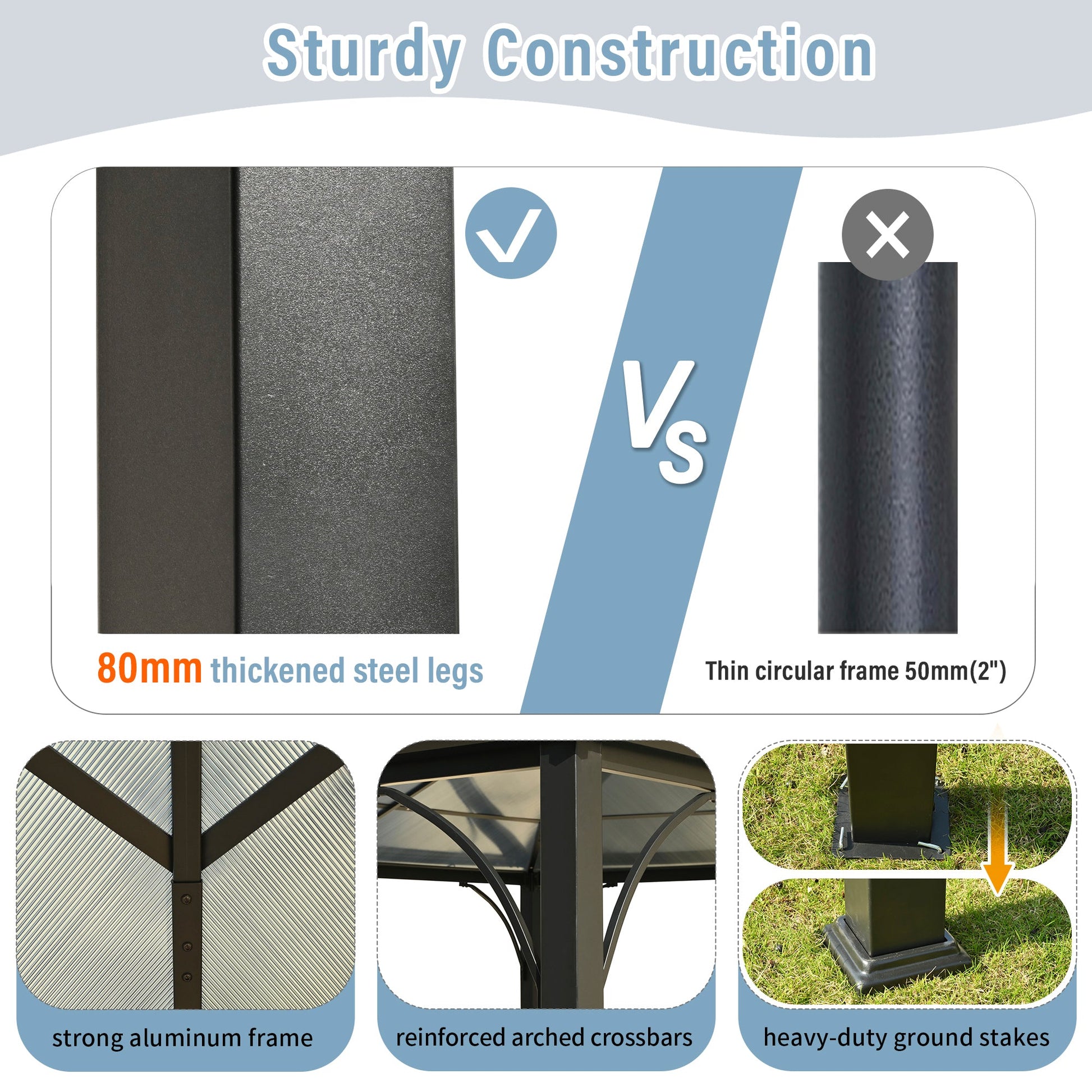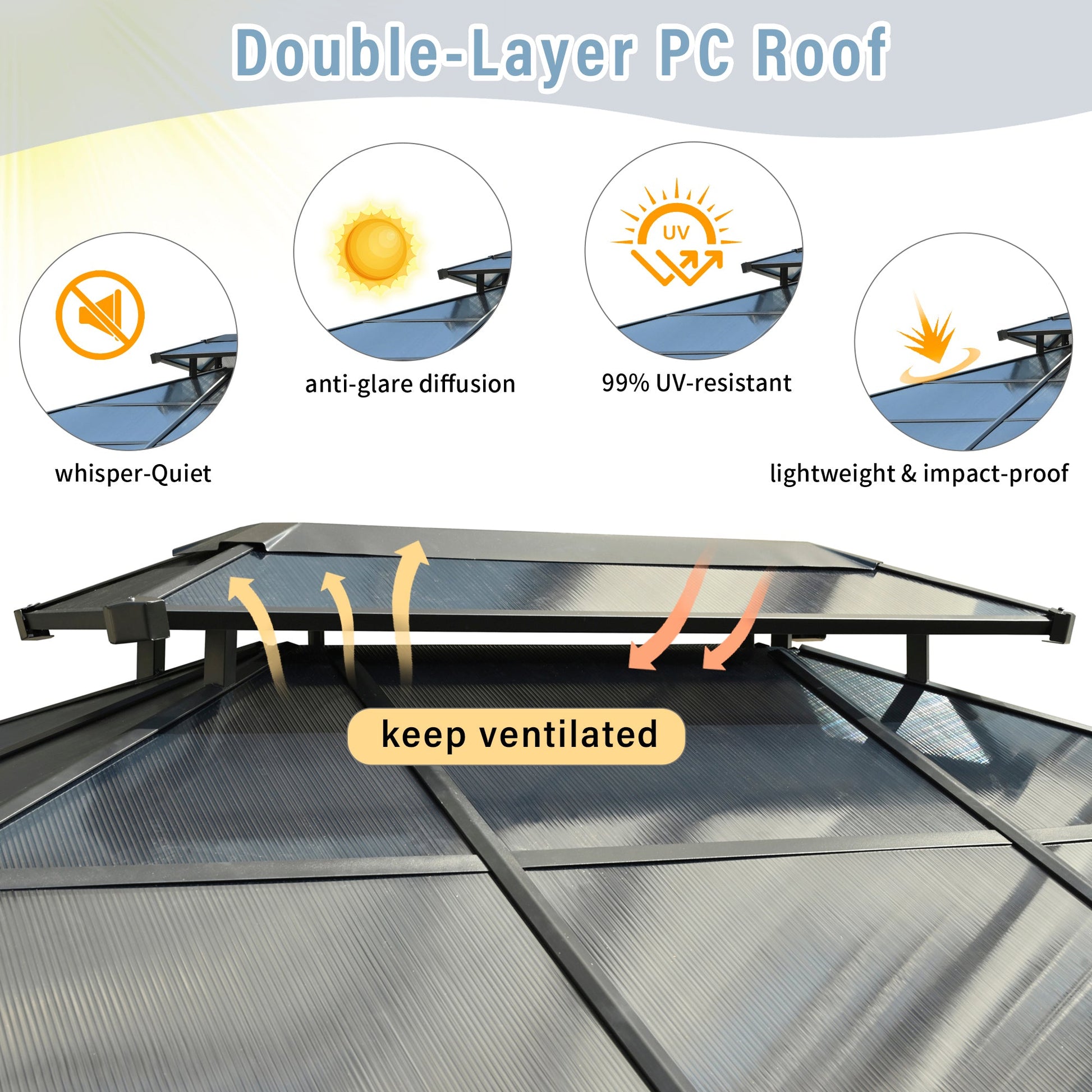 - Premium Double-Layer PC Roof: Featuring a durable polycarbonate (PC) roof panel that blocks 99% UV rays while allowing soft light transmission. The innovative double-layer roof design enhances ventilation, the lower ventilated layer reduces heat buildup for cooler shade. The sloped design prevents water pooling, ensuring year-round protection for your patio, garden, or campsite.