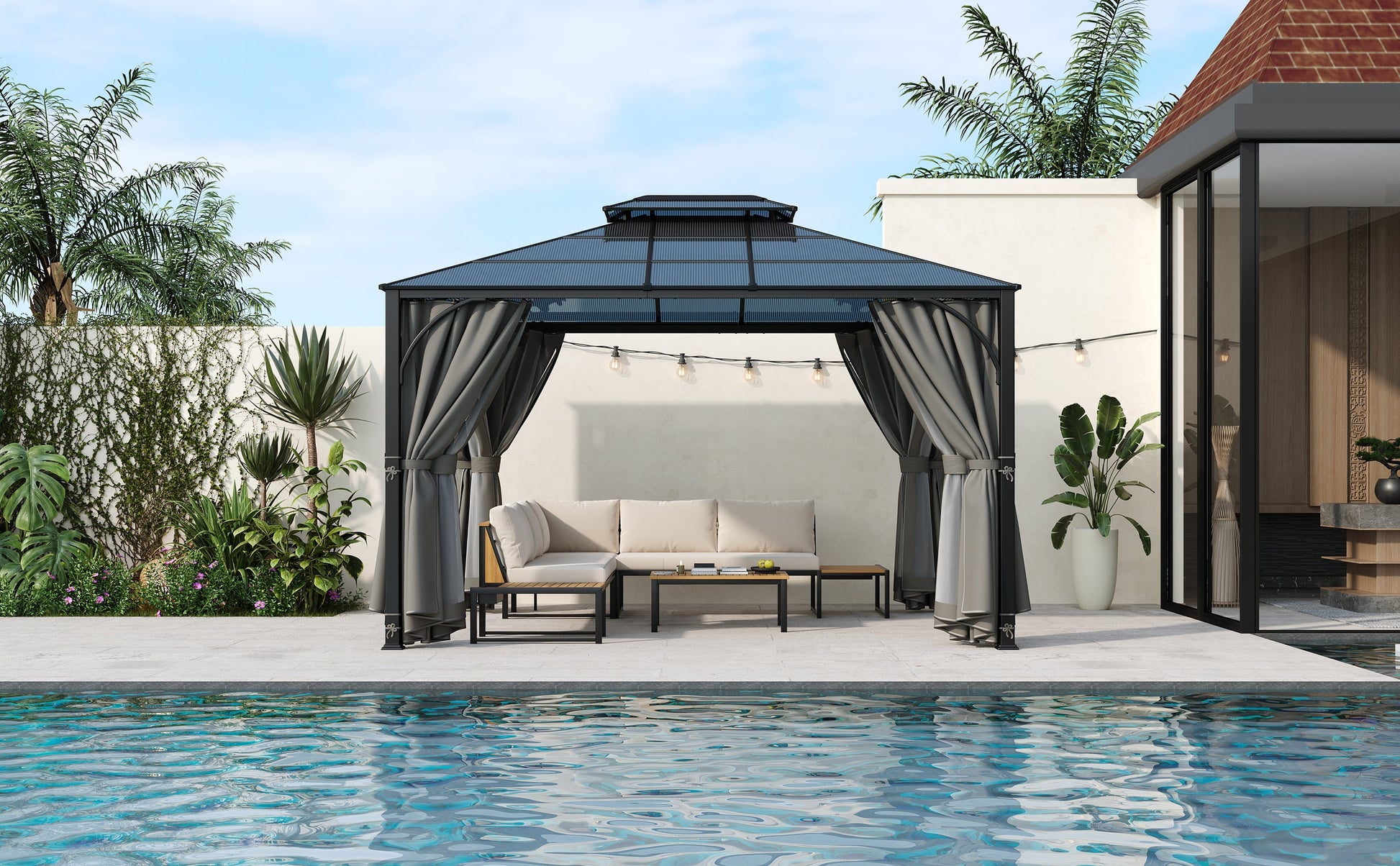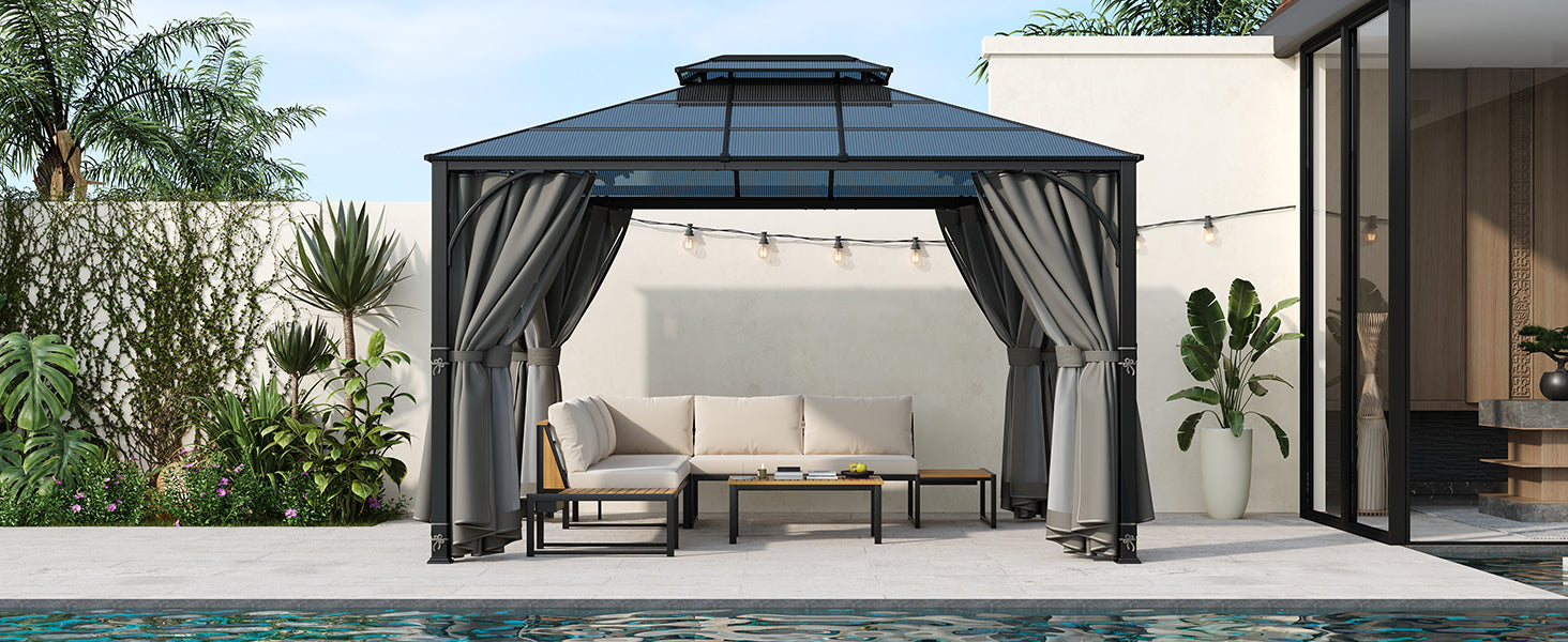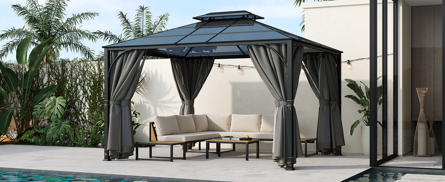 Featuring a durable polycarbonate (PC) roof panel that blocks 99% UV rays while allowing soft light transmission. The innovative double-layer roof design enhances ventilation, the lower ventilated layer reduces heat buildup for cooler shade.
